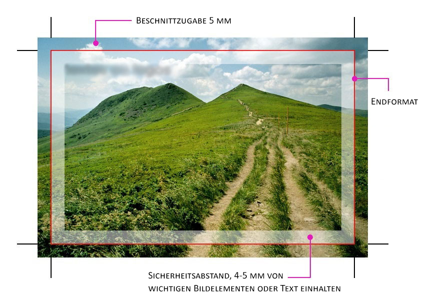 Wir empfehlen alle wichtigen grafische und textliche Elemente in einem Abstand von 5 mm vom Rand des Endformats zu platzieren, damit sie nicht beim Anschnitt beschädigt werden.